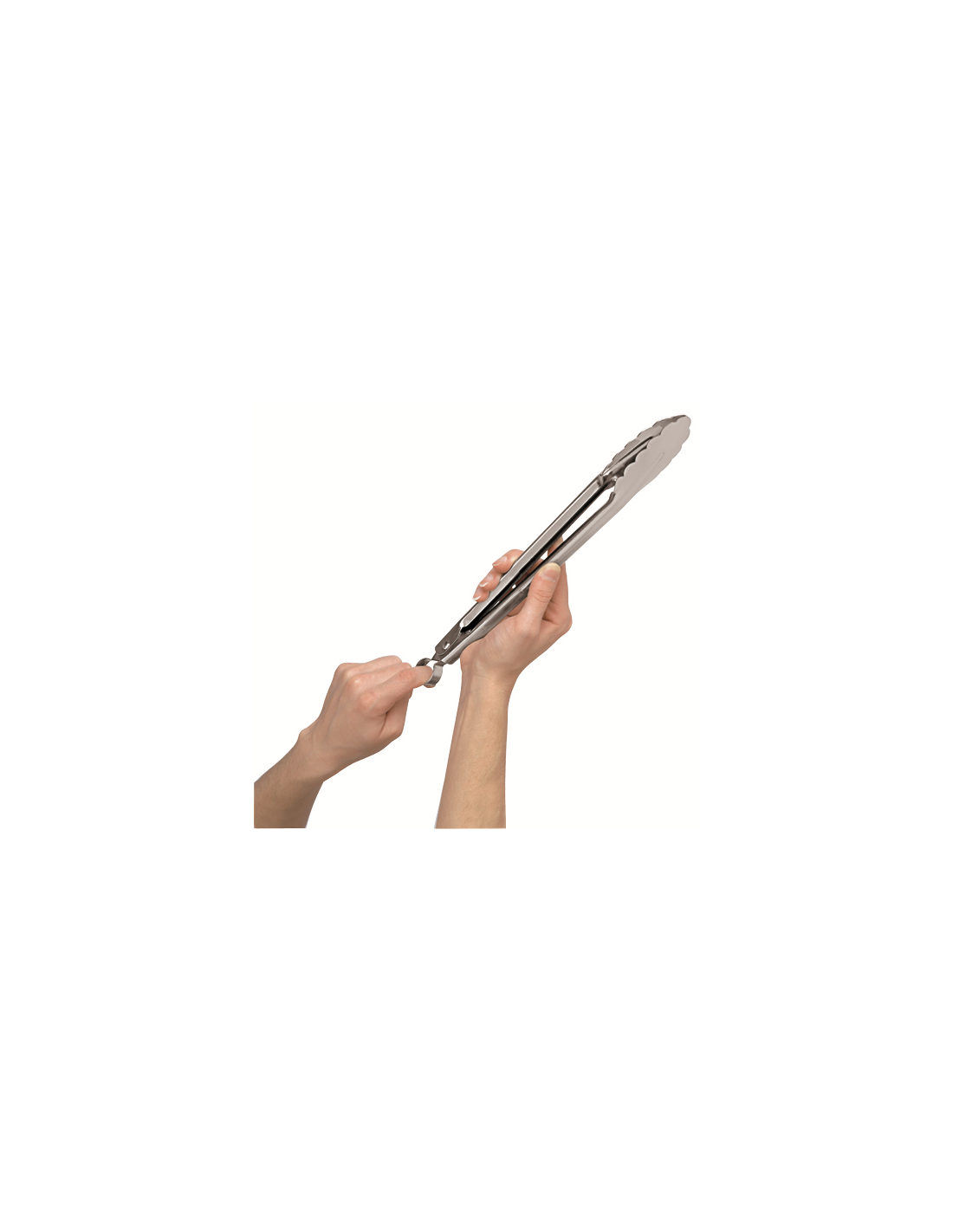 Universele serveertang van Cuisipro volledig van roestvast edelstaal. Ideaal voor de barbecue, door de lengte van 40 cm kom je met je arm niet direct boven de hete kolen. Gegarandeerd lange levensduur. Hij heeft een blokkeermechanisme / sluitsysteem, duwen voor openen en trekken voor sluiten. Door het ophangoog tegen de tafel, aanrecht of tegen jezelf te tikken/duwen gaat hij open. Zo kun je de tang met één hand bedienen, dat is handig als je in de ene hand een schaal of bord vast hebt. Om de tang weer te sluiten heb je pas een tweede hand nodig. De tang kan worden opgehangen aan het ophangoog.