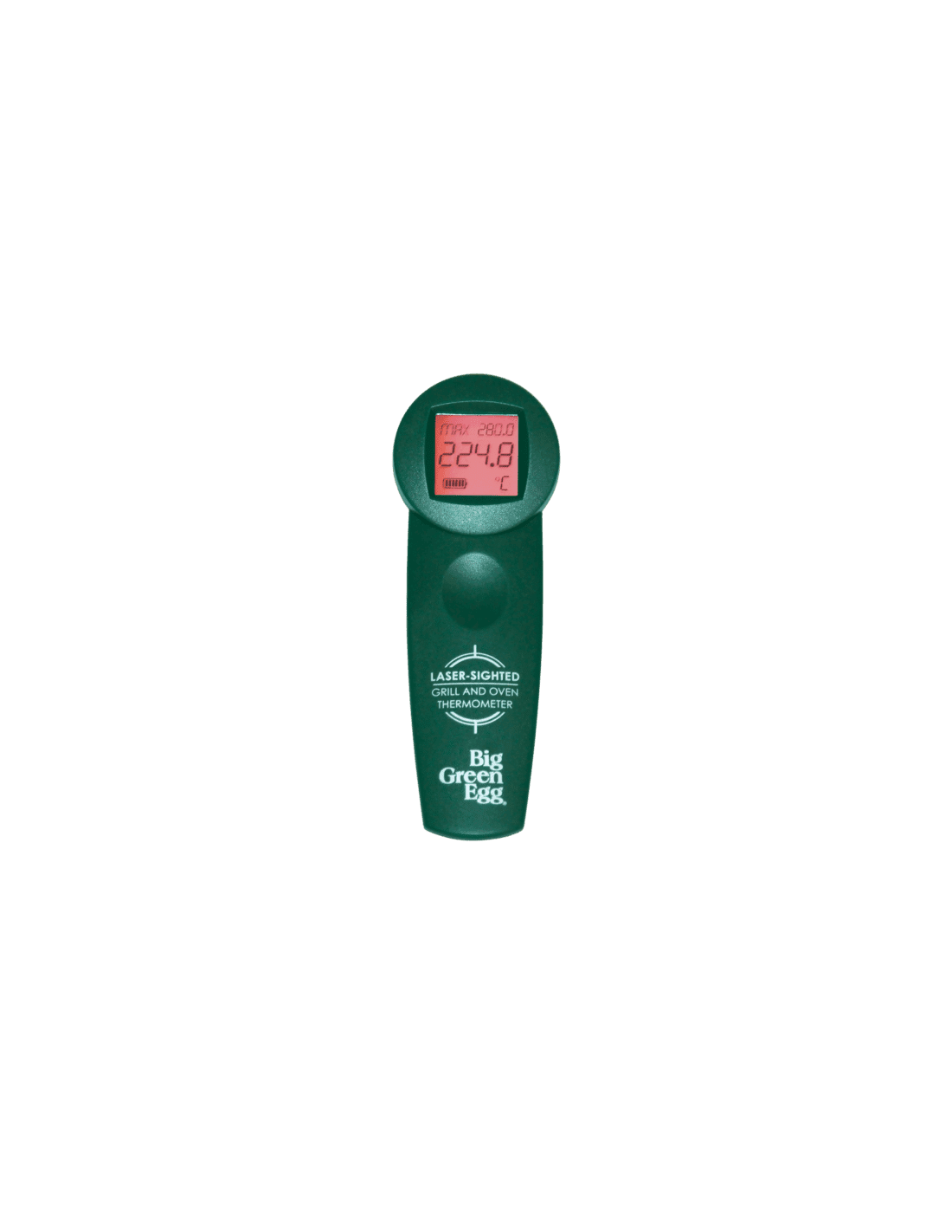 Richt de precisielaser van de Infrarood thermometer op bijvoorbeeld de baking stone of het gietijzeren grillrooster om de temperatuur te meten voordat het voedsel erop wordt gelegd. Binnen enkele seconden verschijnt de temperatuur op het LED-display van de thermometer. De Green Egg infrarood thermometer heeft een temperatuur bereik van 0 °C tot 427 °C.