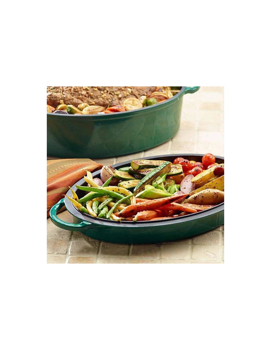 Wat staat er toch te stoven in de Green Dutch Oven? Deze multifunctionele braadpan is een uitkomst als je coq au vin, soep, chili of een cobbler of crumbler (desserts) maakt. Hij kan ook in je gewone oven en wordt alleen maar mooier met de jaren. Door de fraaie afwerking zet je hem met trots op tafel. De ovale Green Dutch Oven heeft een inhoud van 5,2 liter (35 cm)