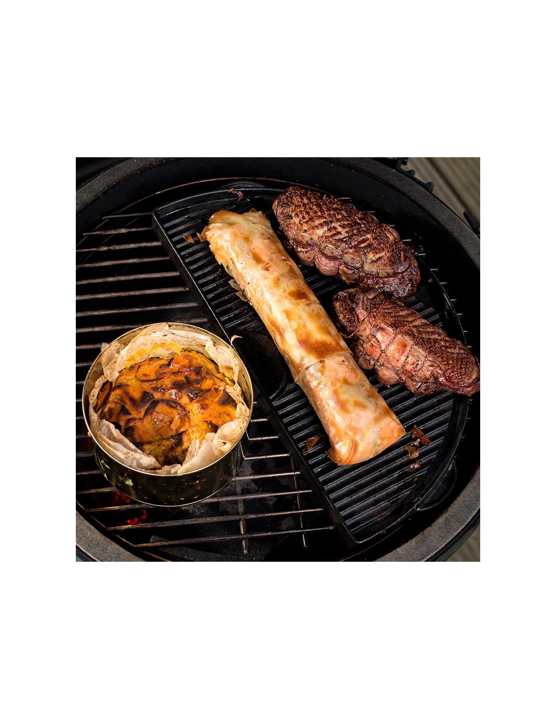 Doordat de Big Green Egg gietijzeren grill-bakplaat slechts de helft van het grilloppervlak in beslag neemt kun je intussen ook andere ingrediënten bereiden.