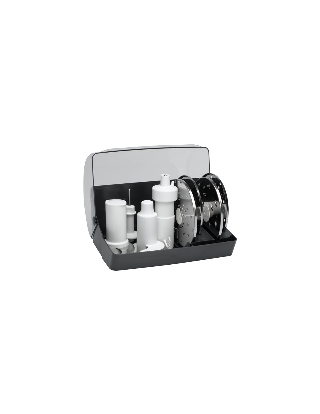 De machine is compleet en toch zeer compact. Met 3 mengkommen kies je telkens de juiste grootte en kun je meerdere bereiding achter elkaar maken. Verschillende messen, opklop- en kneedtools, 2 plakjes- en 2 raspschijven, het blendermix blenderhulpstuk voor het maken van smoothies en een handige spatel. Alle accessoires passen in de meegeleverde opbergdoos. De messen en schijven zijn gemaakt door Sabatier.
