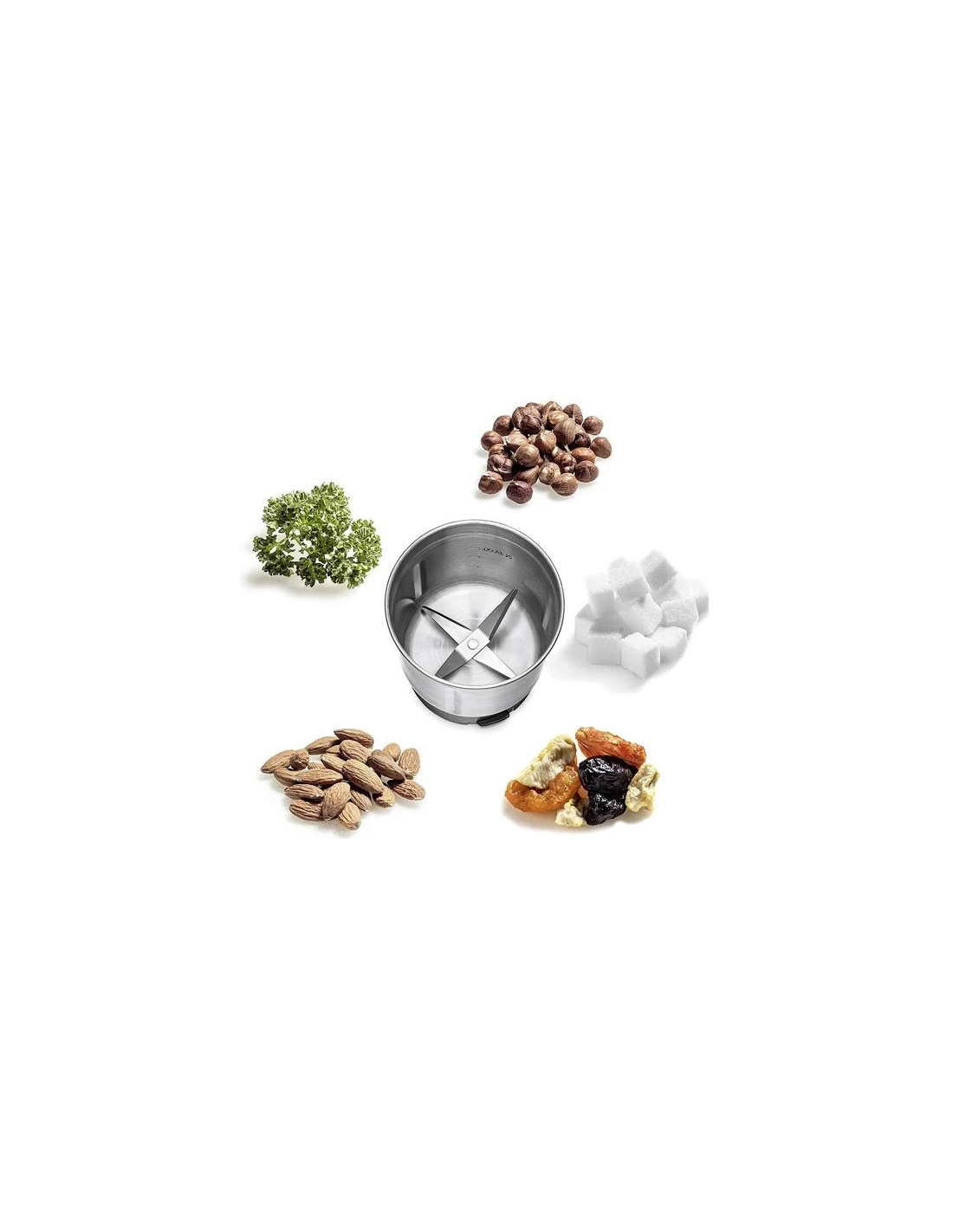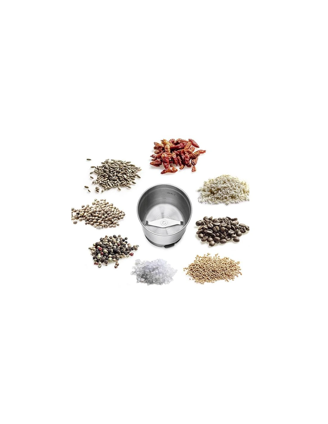 Specerijenmolen / Koffiemolen voor malen van koffie en het maken van lekkere specerijenmengsels, pesto, poedersuiker of smakelijke dips. De molen heeft 2 RVS houders. Eén maalbakje voor koffie, specerijen en droge ingrediënten. Het tweede maalbakje heeft een maalwerkje met 4 messen voor het maken van pesto, dips, enz.