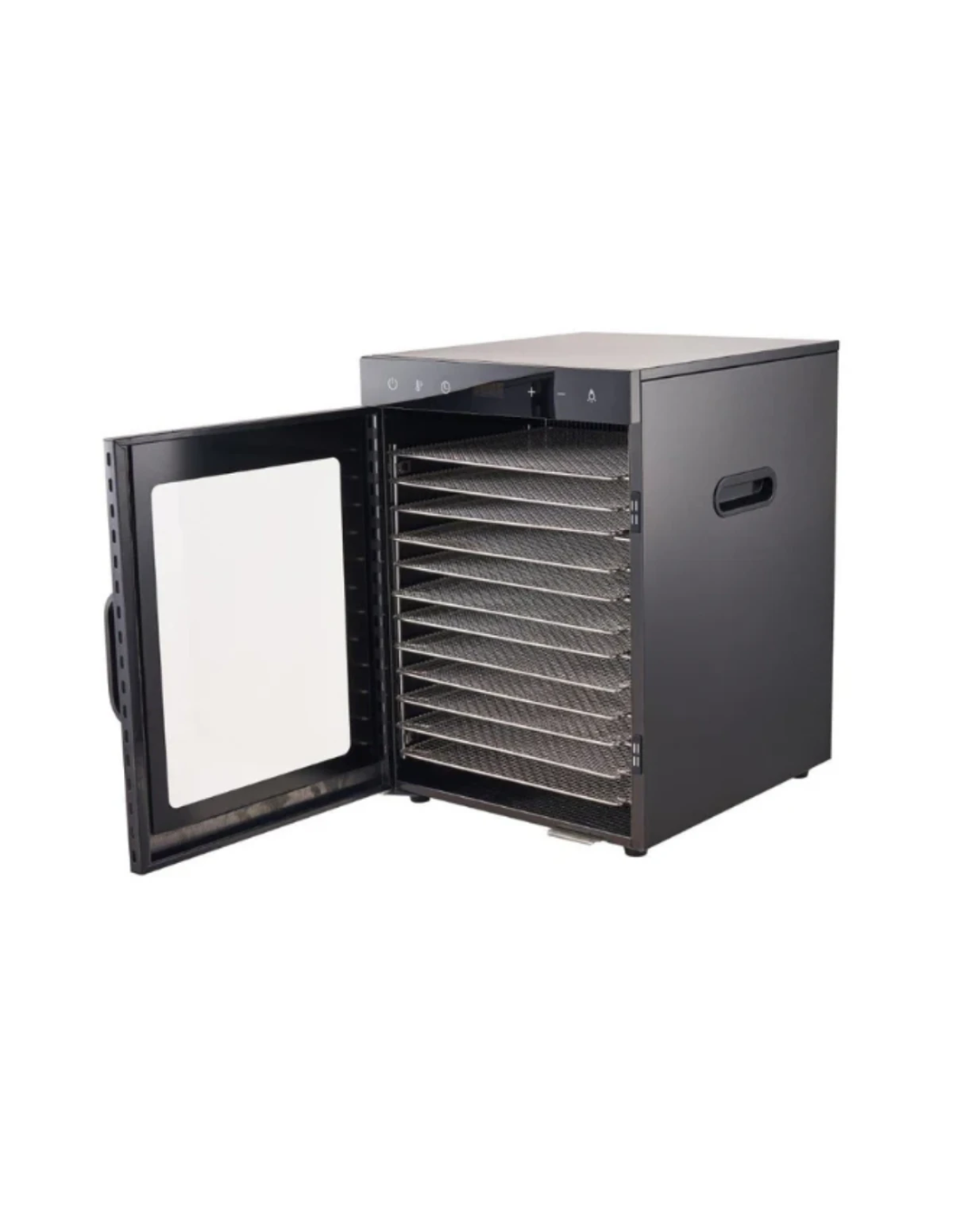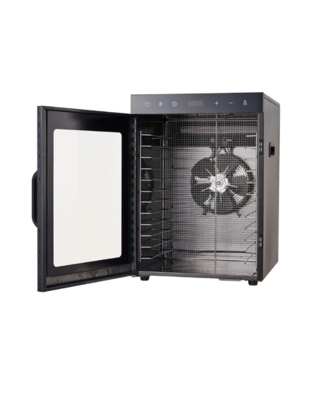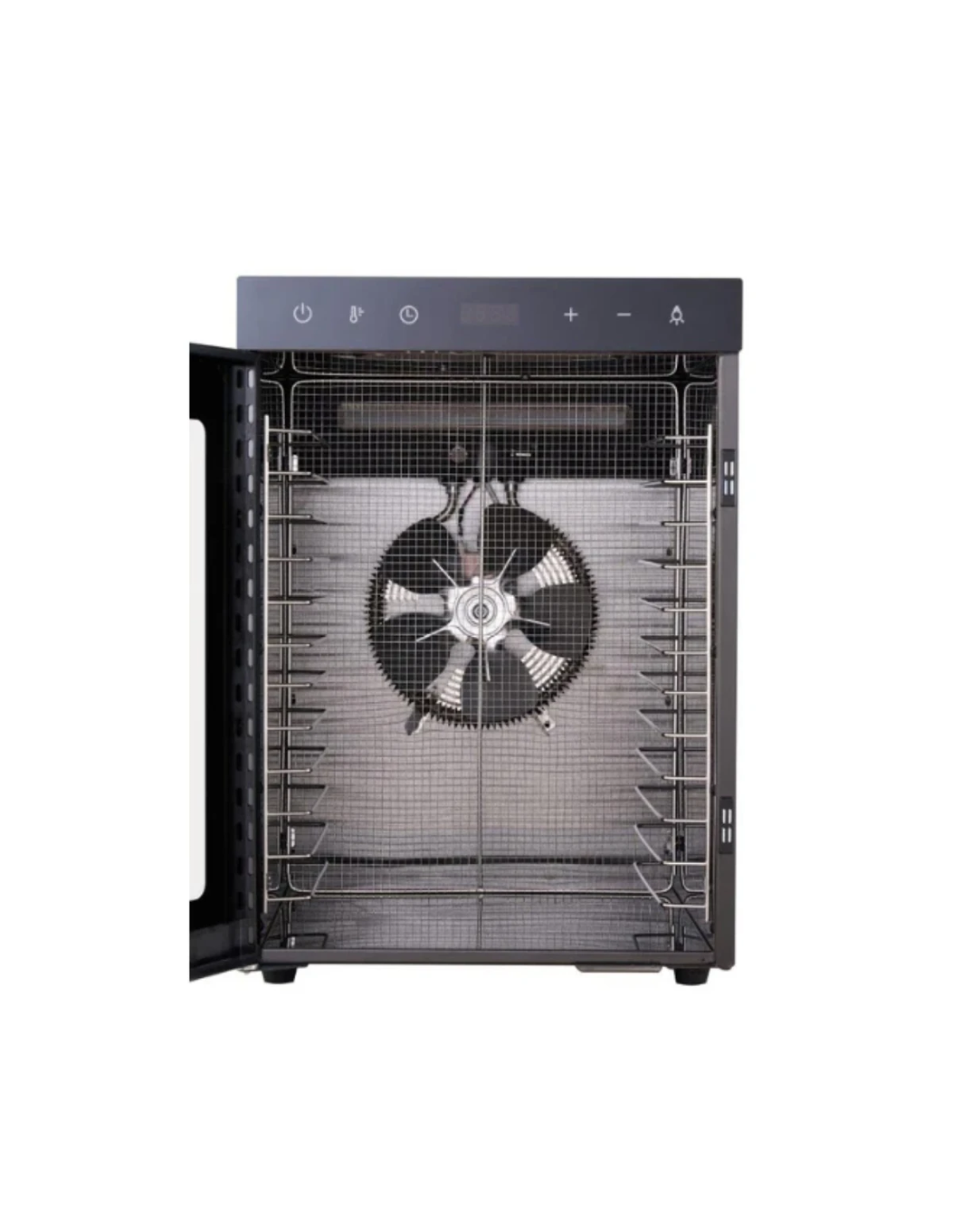De horizontale luchtstroom zorgt ervoor dat de warmte gelijkmatig over alle 12 laden wordt verdeeld, waardoor je ingrediënten op elke laag exact dezelfde droogkwaliteit bereiken zonder de laden te verplaatsen.