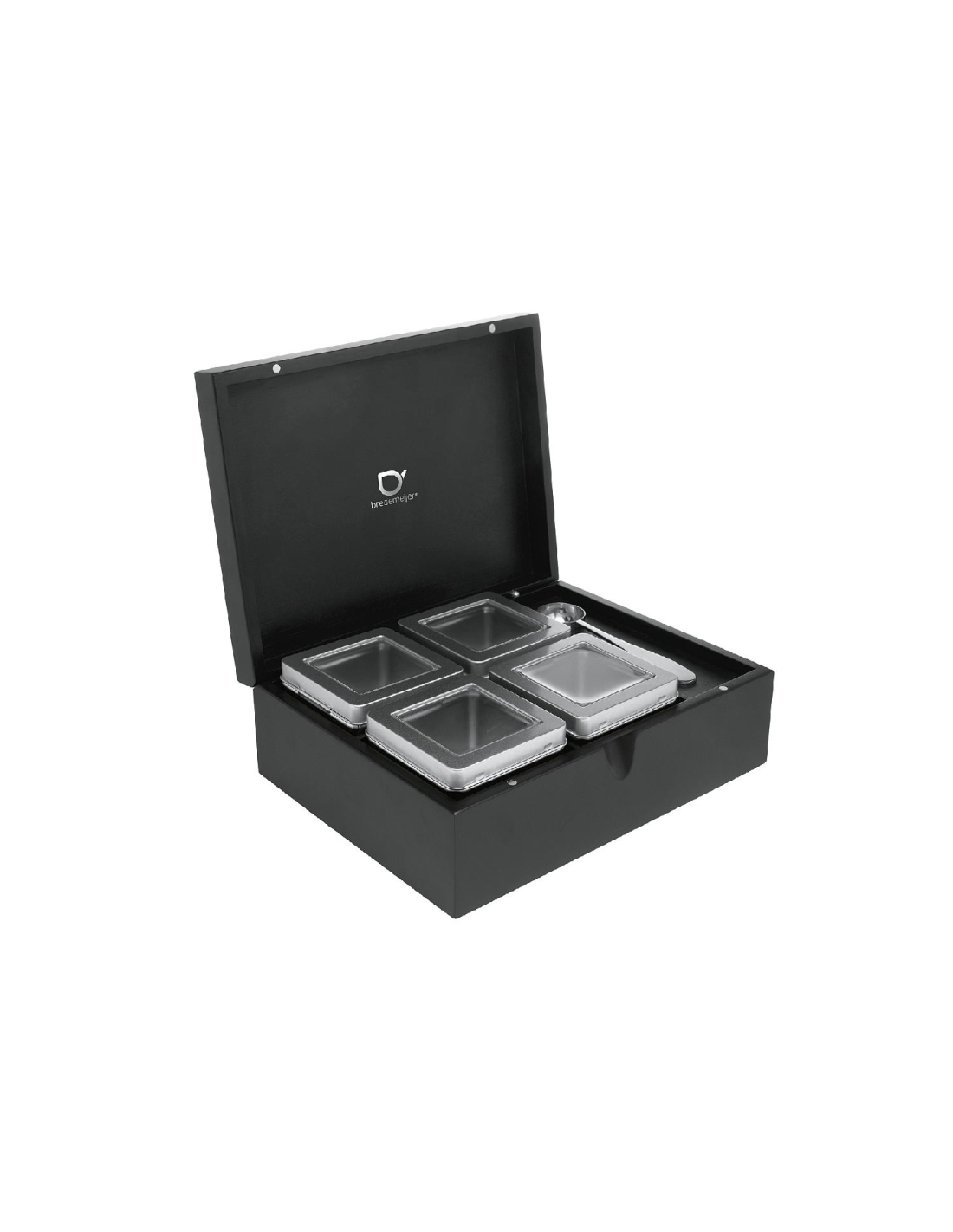 Bewaar je losse thee in deze stijlvolle theedoos van Bredemeijer. De 4 blikjes hebben een doorzichtig deksel zodat je kunt zien welke thee in welk blikje zit. Met het maatschepje schep je de juiste hoeveelheid thee voor een kopje. Het deksel van de theedoos is makkelijk te openen door het uitgeslepen gootje aan de voorzijde en sluit goed door twee magneetjes.