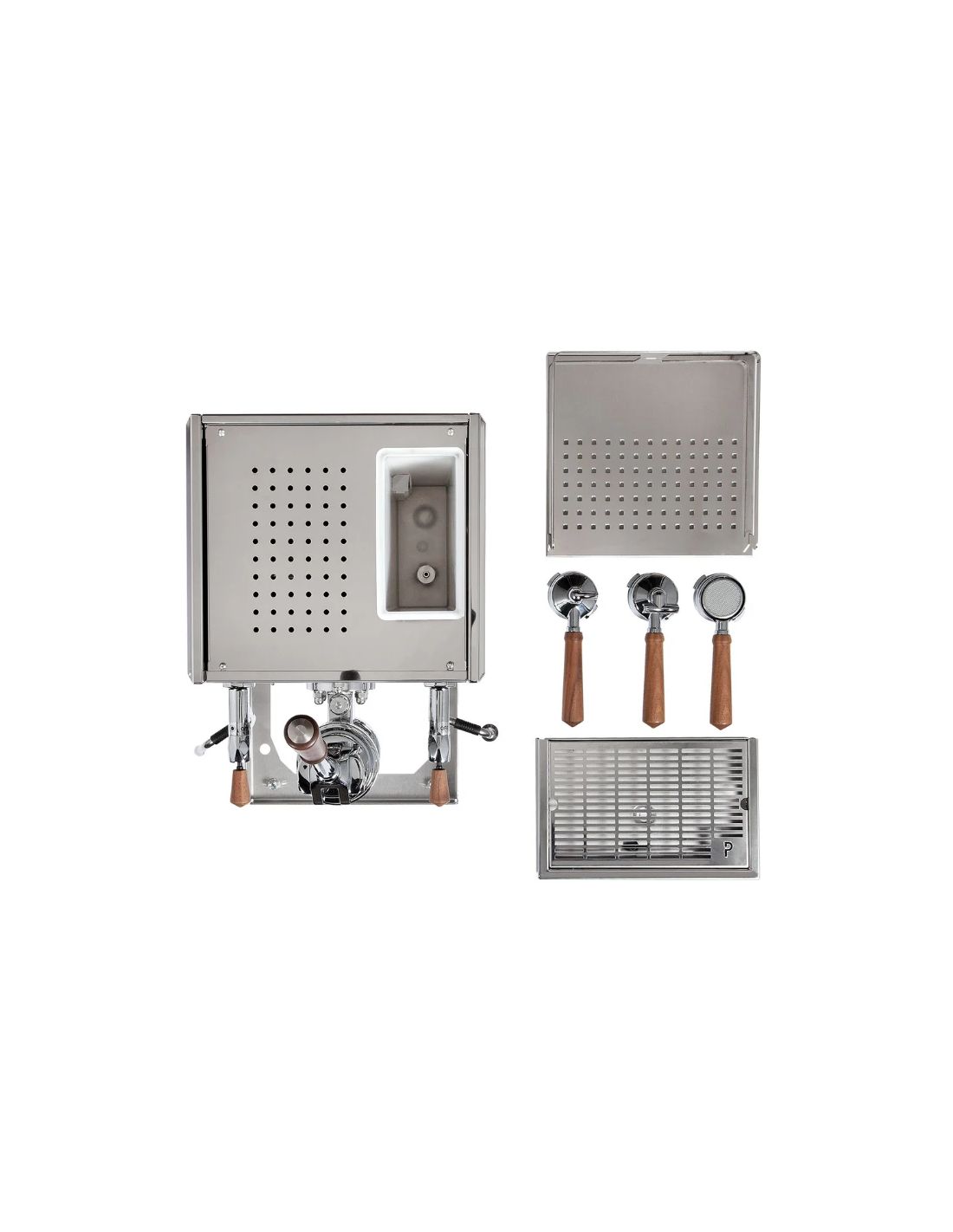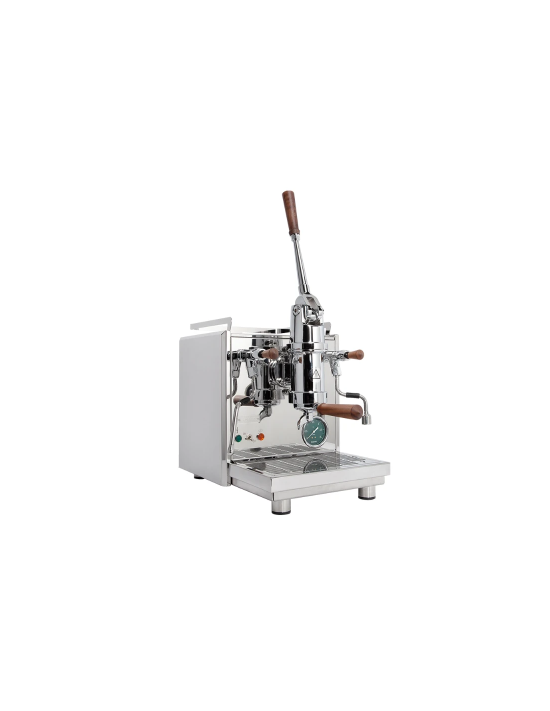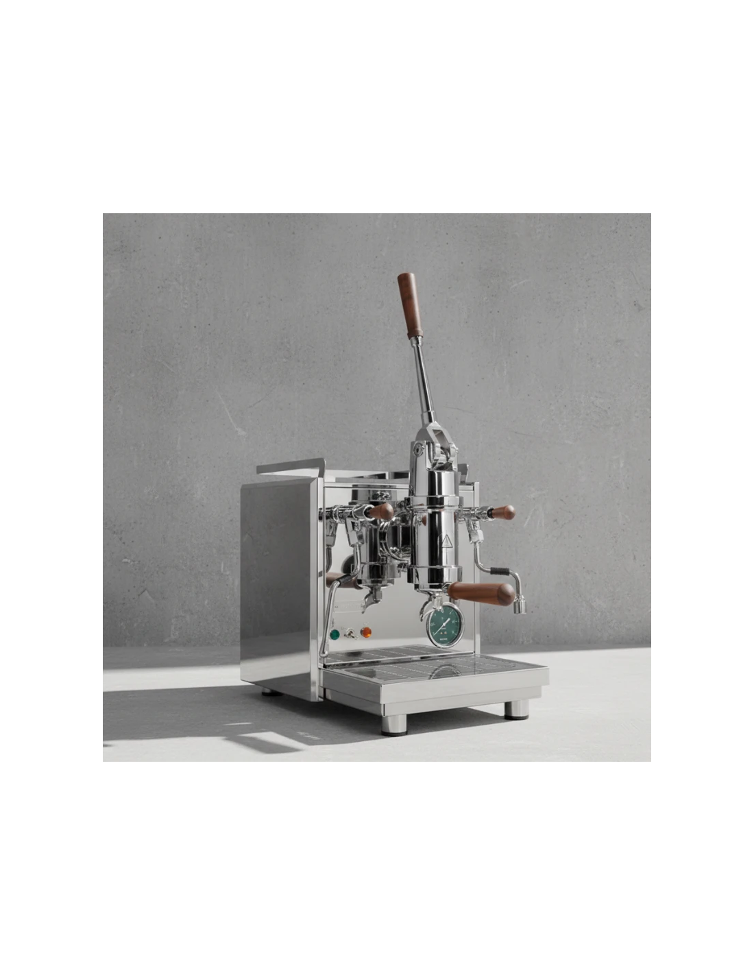 Vakmanschap in elk detail Wat deze machine werkelijk bijzonder maakt, is de combinatie van brute kracht en elegante verfijning. De hendels en filterdragers zijn met de hand vervaardigd uit edel notenhout, wat zorgt voor een warme en natuurlijke grip. Het klassieke ontwerp wordt geaccentueerd door een opvallende dennengroene manometer die perfect harmonieert met het gepolijste roestvrij staal. Achter de lekbak vind je de moderne PID-regelaar, waarmee je de temperatuur van de grote koperen boiler nauwkeurig instelt zonder dat het afbreuk doet aan de tijdloze uitstraling van de machine.