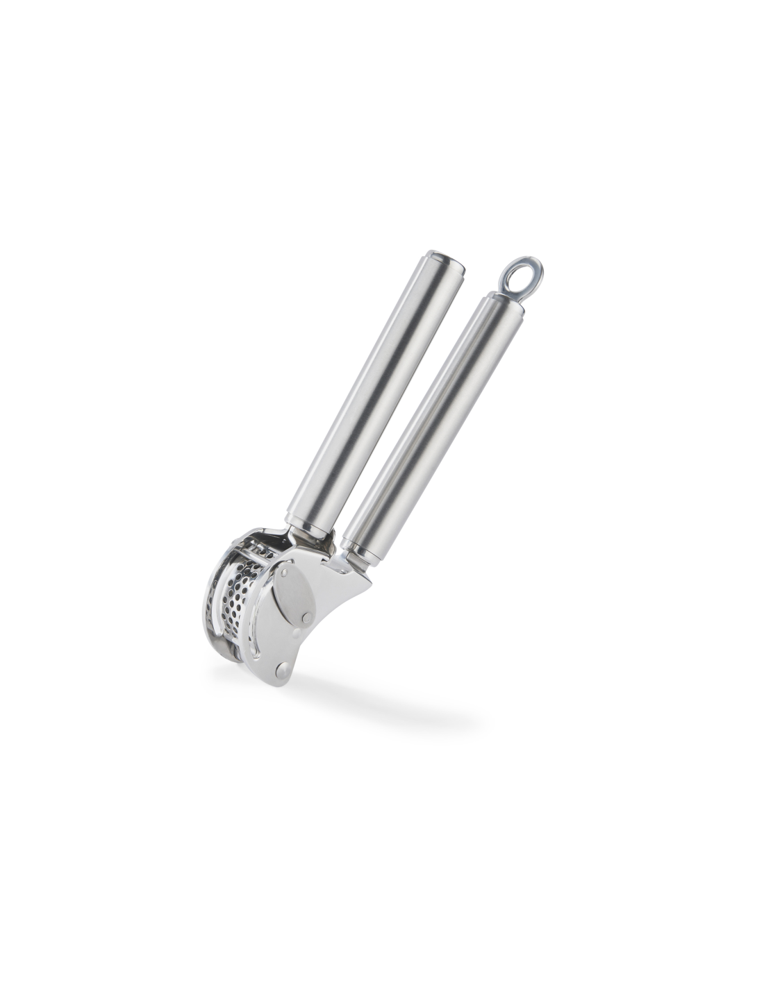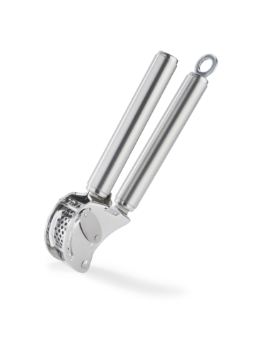 Gemakkelijk te gebruiken knoflookpers, je kunt er zelfs hele (ongepelde) knoflookteentjes mee persen. Bij voorkeur snijdt je wel het houtachtige kontje van het teentje. Door de dubbele hefboom van de knoflookpers kun je met weinig moeite veel kracht ontwikkelen om de knoflook fijn te persen. Wil je meer dan één teentje persen is het makkelijker om de teentjes even te pellen, dan pers je ze zonder problemen achter elkaar uit en hoef je minder vaak de zeef vrij te maken.