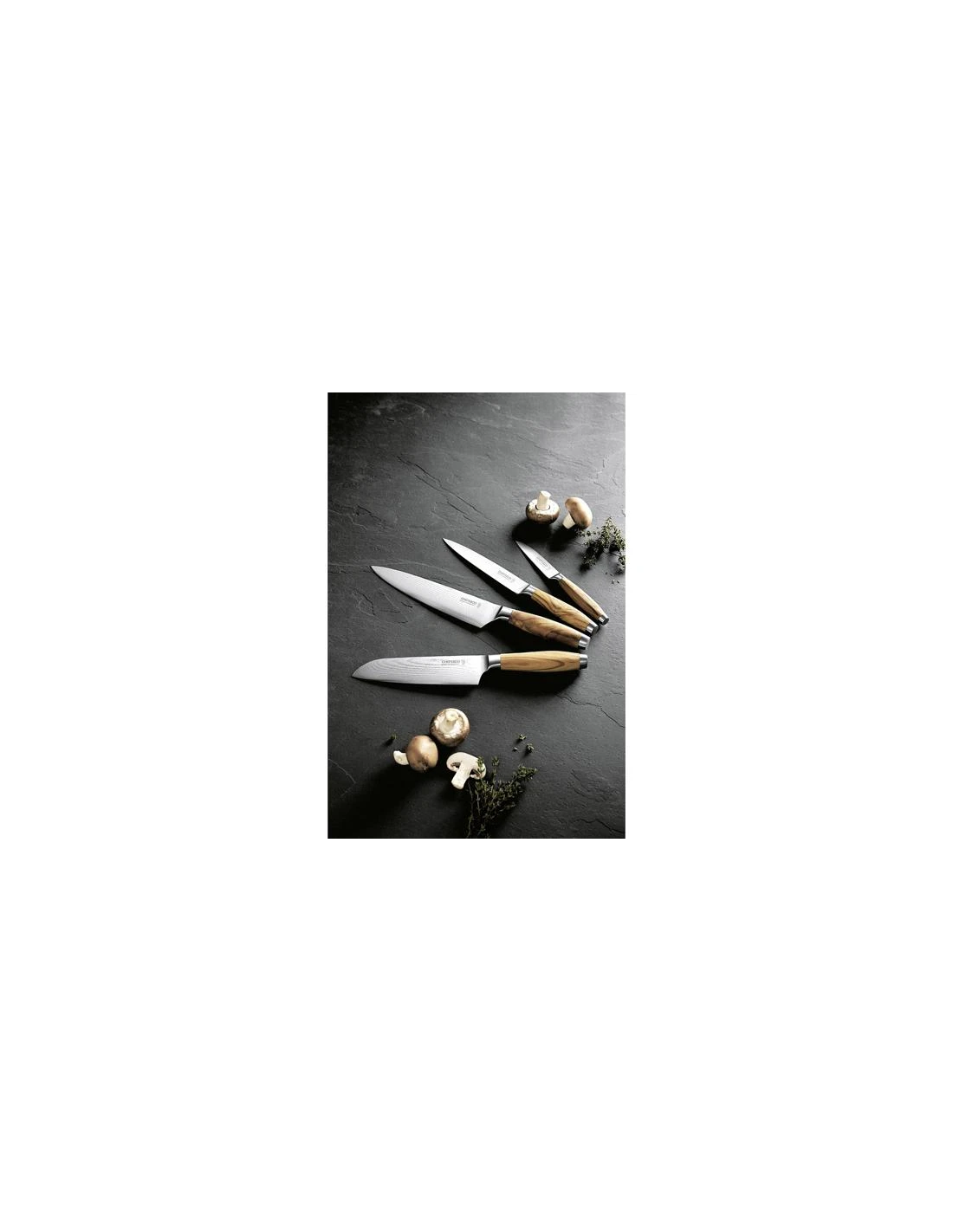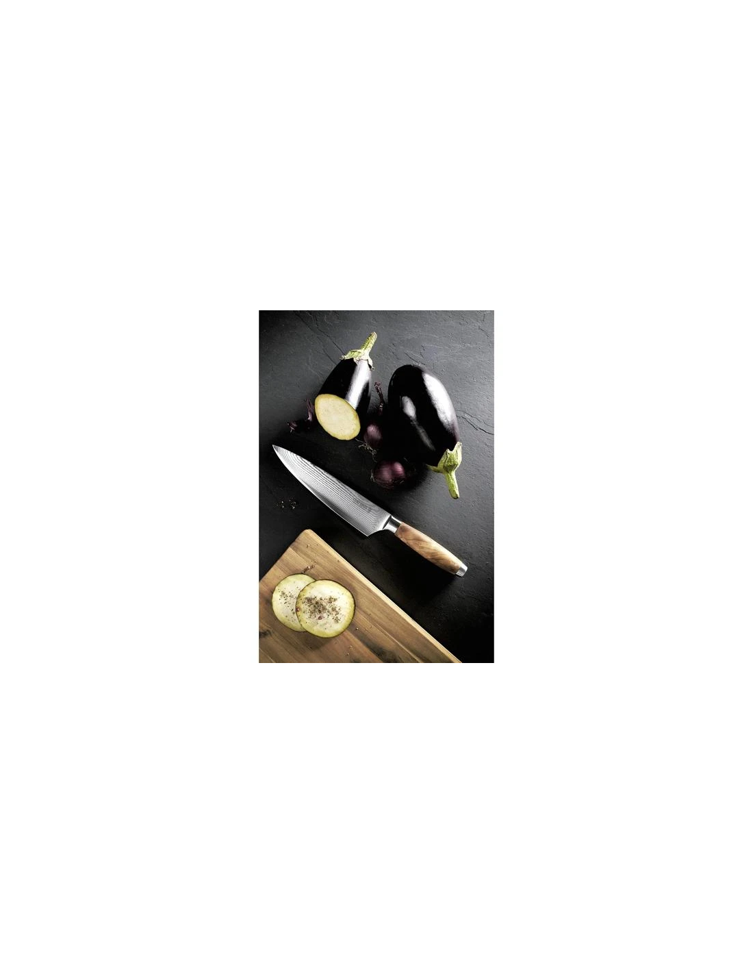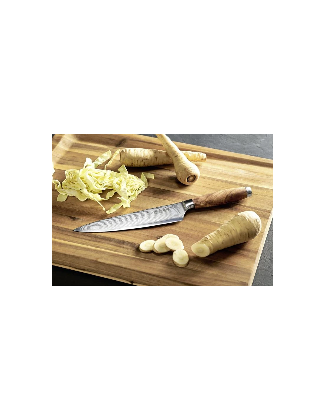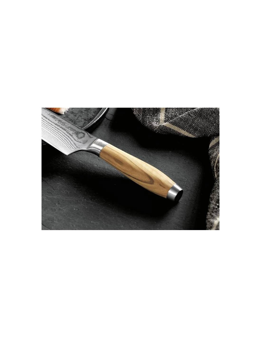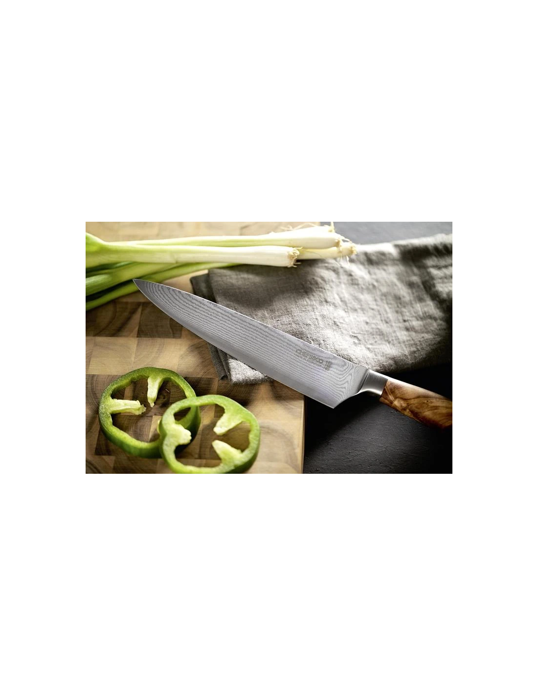 Dit exclusieve koksmes is gemaakt van eersteklas Damascus staal VG10, waardoor het uitzonderlijk scherp en duurzaam is.. De messenserie Damast biedt iedere professionele en hobbykok veel plezier bij het bereiden van voedsel. Het prachtig gevormde ergonomische dubbele bolster handgreep van olijfhout geven het mes een aangename balans en maken het gemakkelijk veilig te hanteren. Een aangenaam mes voor het wiegen, hakken en snijden van vlees, vis, fruit en groenten.
