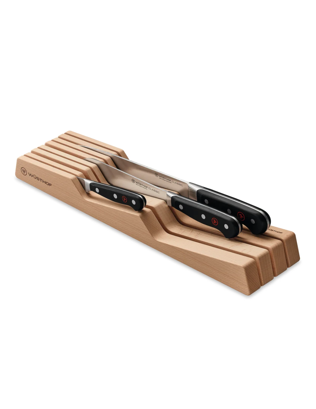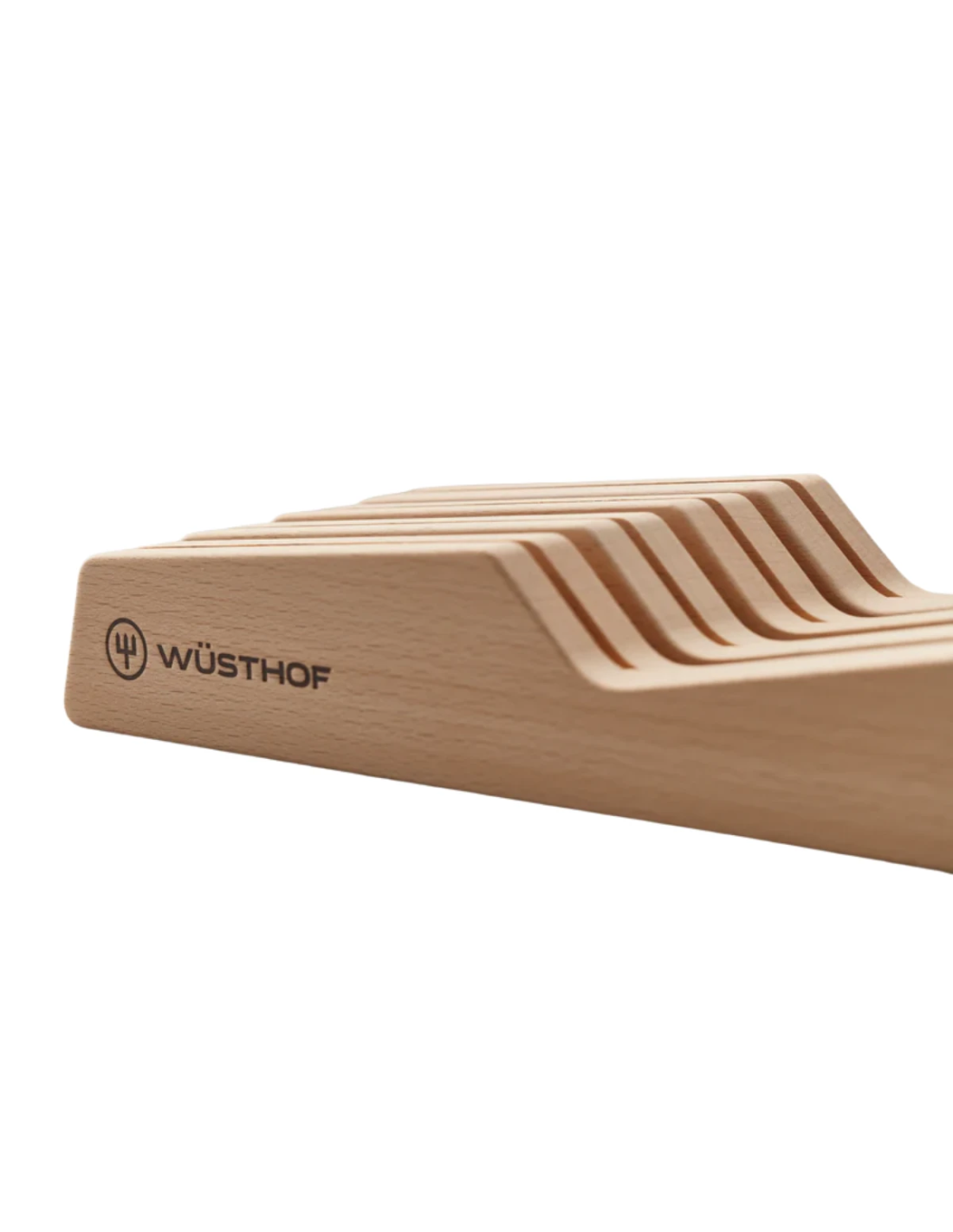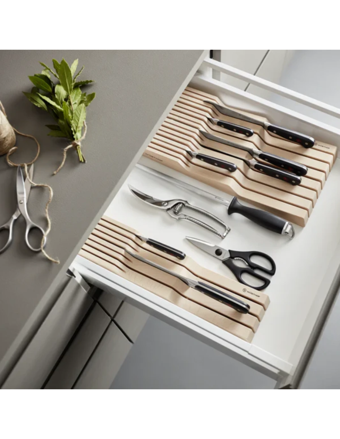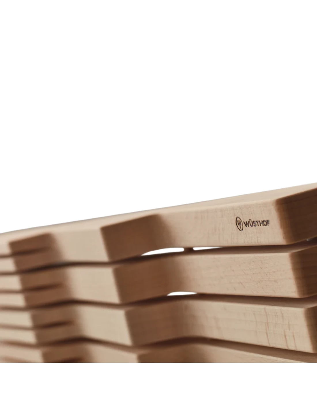 Met dit bijzondere opbergblok blijven messen, vingers en de lade onbeschadigd. De messen passen namelijk netjes in het blok, zo liggen ze veilig en kom je niet perongeluk tegen een scherp lemmet. De lade raakt ook niet beschadigd van losliggende en schuivende messen. Omdat de netjes en stevig opgeborgen liggen blijven de messen perfect scherp en worden ze niet bot van tegen elkaar botsen en schuiven.