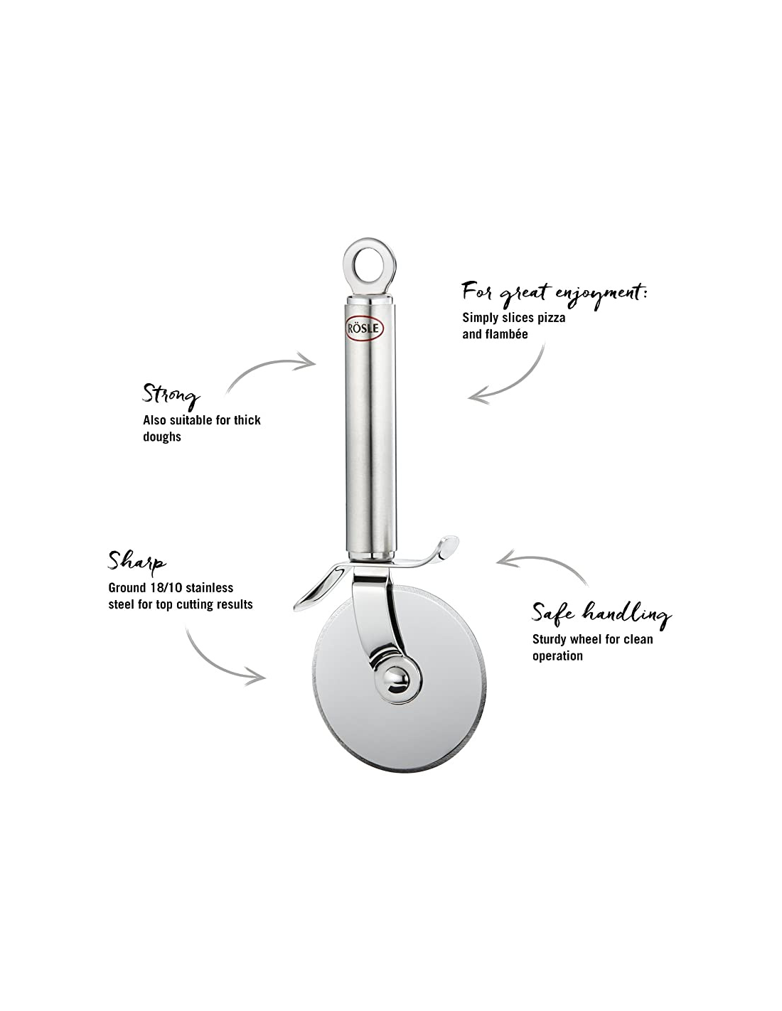 De Rösle pizzasnijder is vervaardigd uit roestvrijstaal en heeft een totale lengte van 19,5 cm. Het ronde mes heeft een diameter van 7 cm. De pizzasnijder met zijn grote stevig verankerde wiel garandeert recht snijden en snijdt eenvoudig uw dikke en dunne pizza's door zonder het beschadigen van de garnering. Na gebruik is de snijder op te hangen aan het ophangoog.