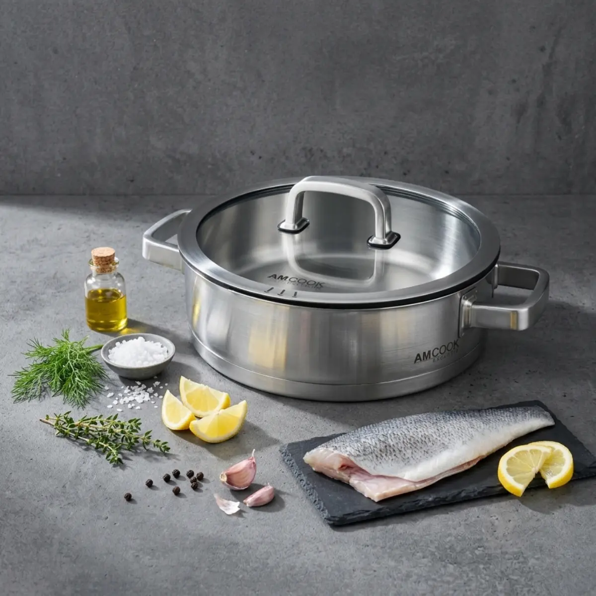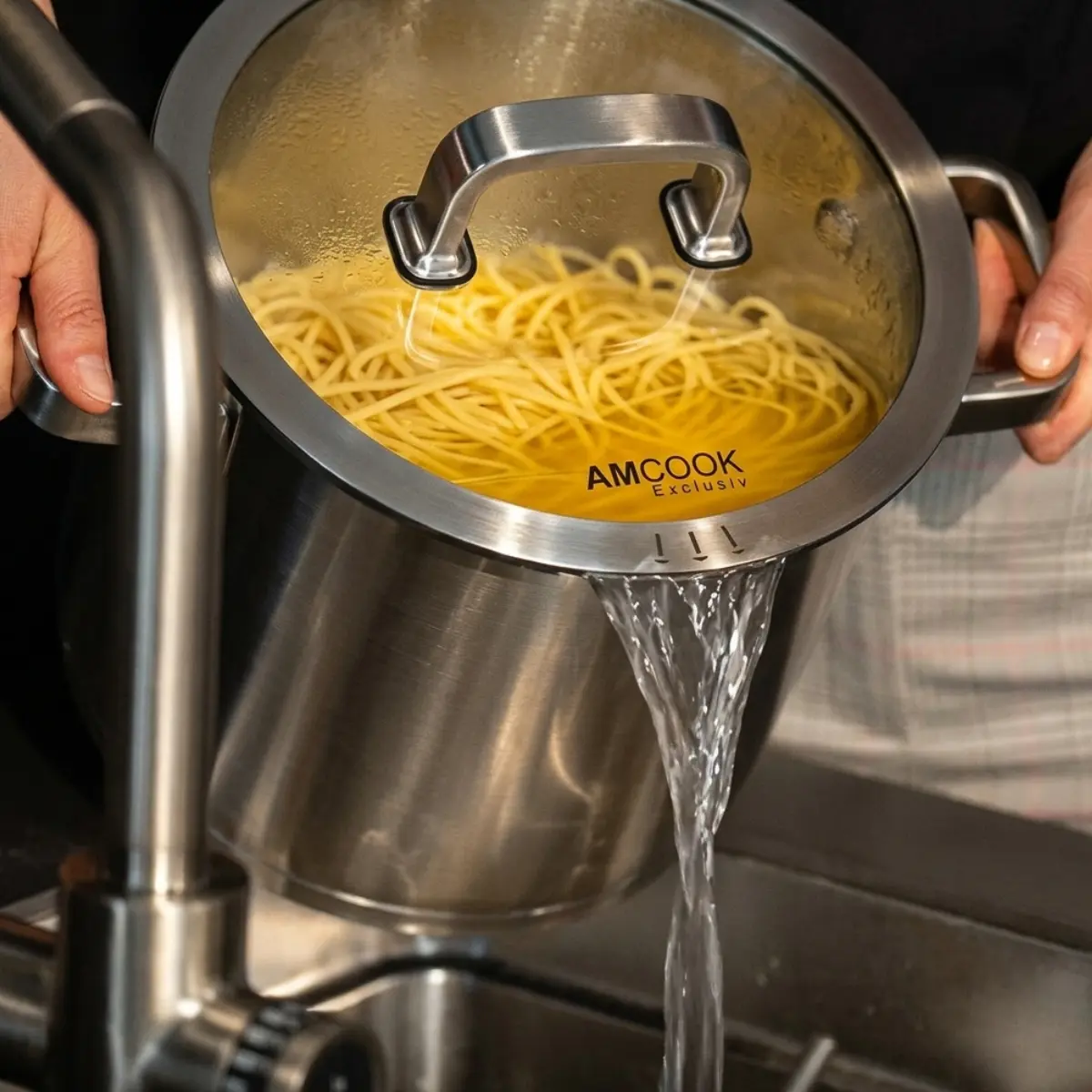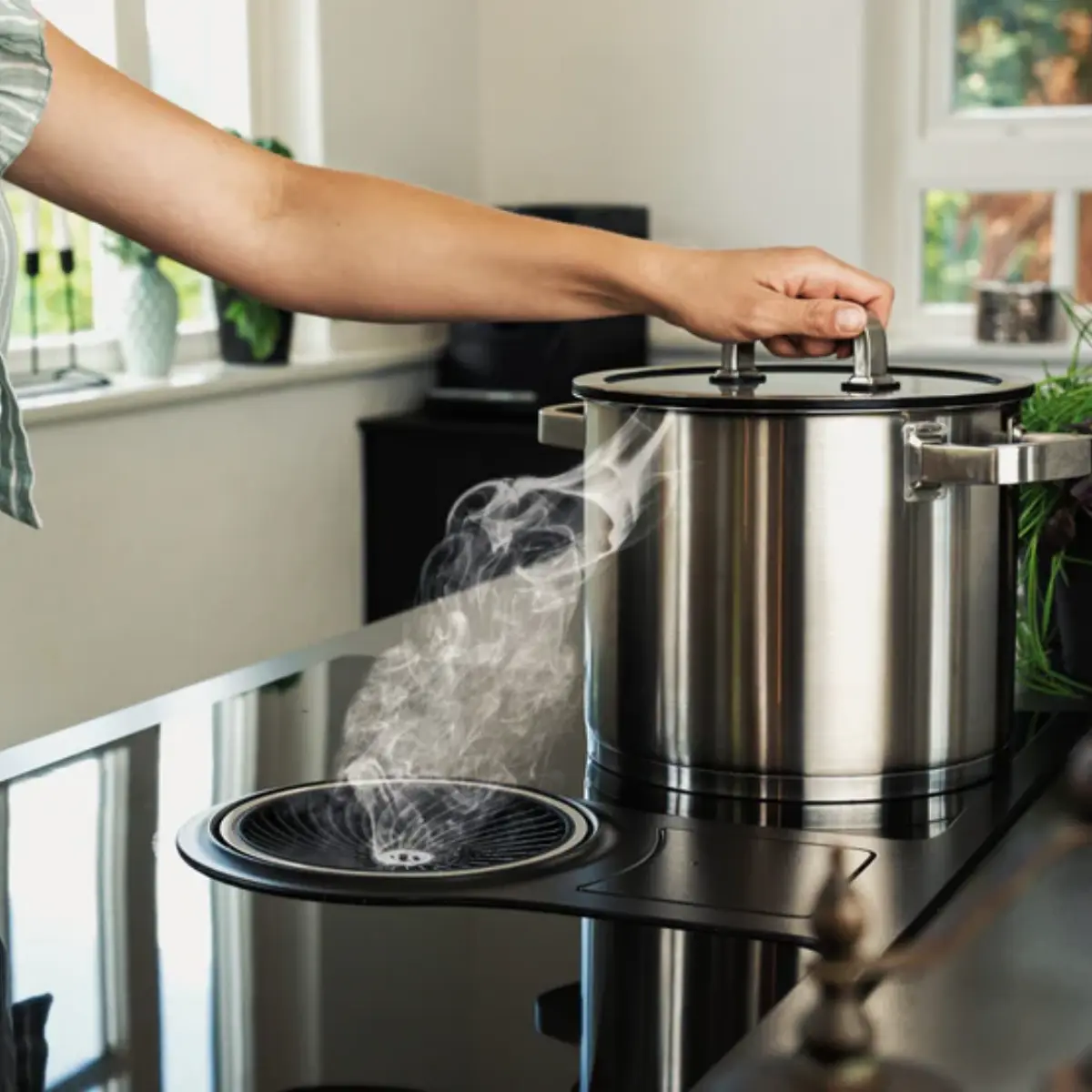 Door het speciale ontwerp van de deksels (niet meegeleverd) worden dampen, geuren en vet op één punt naar buiten geleid en kunnen daarom eenvoudig worden opgezogen door alle wand-, plafond- en kookplaatafzuigsystemen. Door te koken met gesloten deksel beperk je kookluchtjes en bespaar je veel energie én tijd.