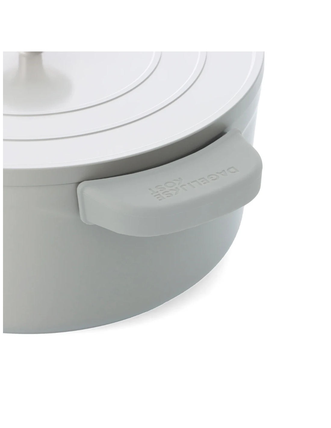 De keramische antikleeflaag maakt het koken intuïtief en prettig. Ingrediënten laten gemakkelijk los, waardoor je minder vet hoeft te gebruiken en zelfs delicate producten mooi intact blijven. Dankzij het gegoten aluminium deksel houd je de warmte goed vast en blijft de bereiding stabiel, wat vooral bij langzaam garen een duidelijk voordeel is. De meegeleverde siliconen grepen zorgen voor extra veiligheid wanneer je de pan verplaatst.