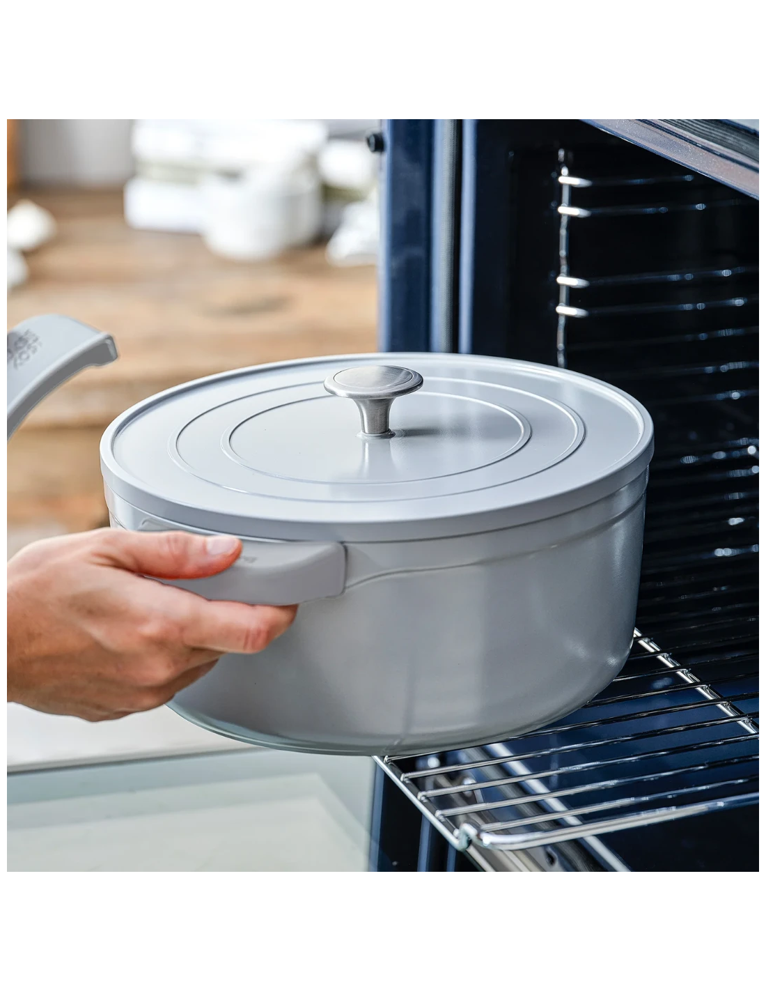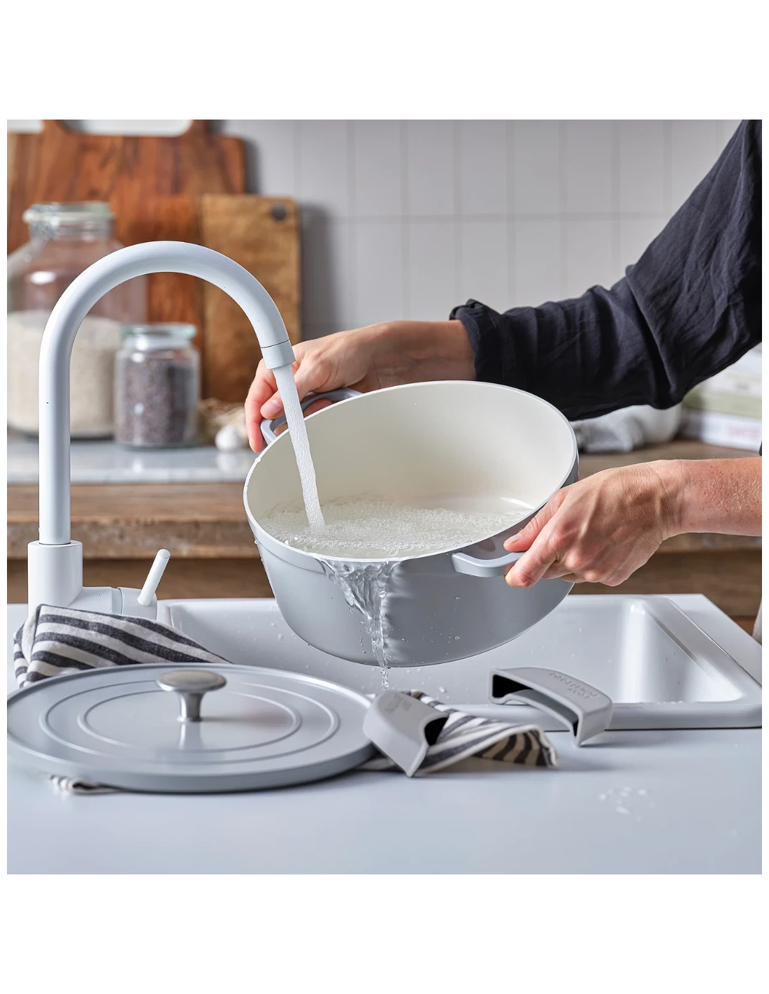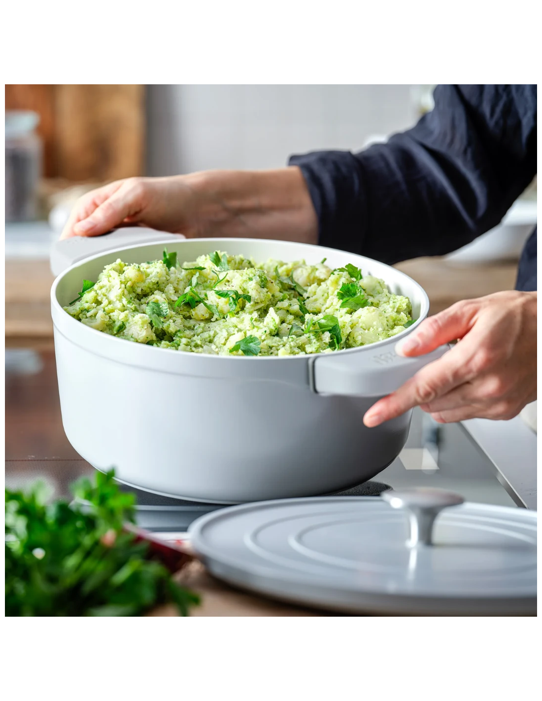 Het truffelgrijze ontwerp met crèmekleurige binnenkant geeft de pan een warme, moderne uitstraling die past in uiteenlopende keukens. De pan is vervaardigd uit hoogwaardig gerecycled cast aluminium dat niet alleen licht in de hand ligt maar ook bijzonder sterk is. Dat verhoogt het kookcomfort en draagt bij aan een duurzamere keuze.