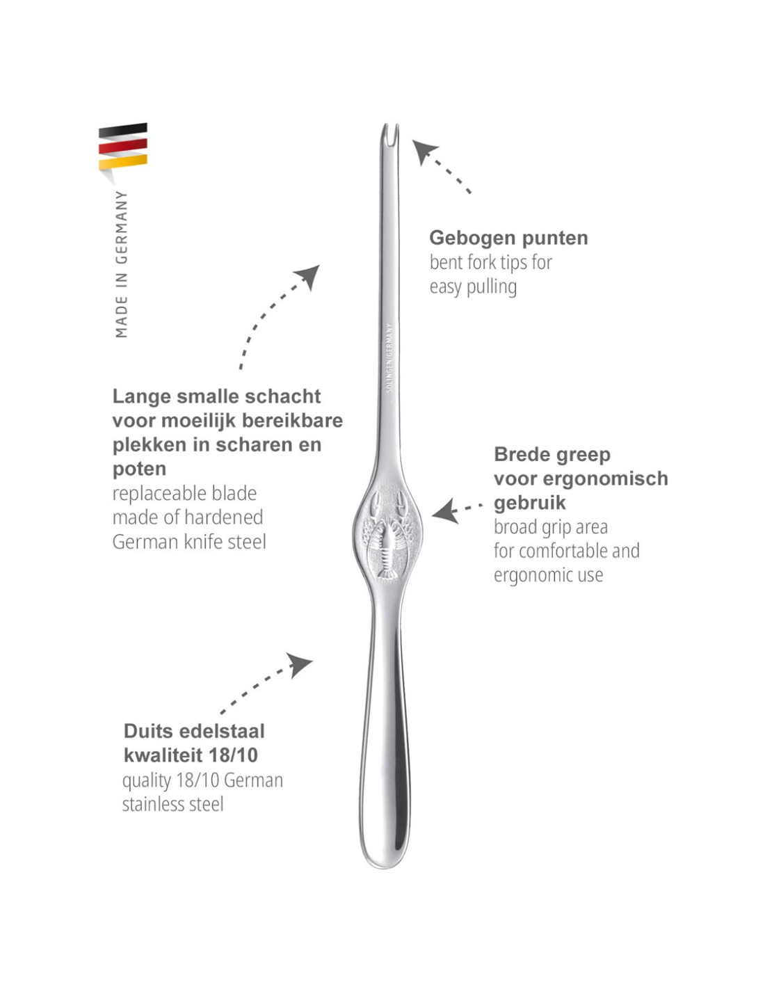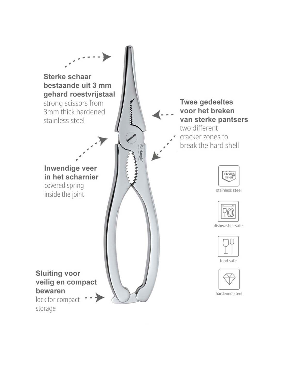 Deze Triangle 7-delige kreeftenset bevat 6 vorken en 1 kreeftenschaar. Dankzij het speciale ontwerp kan de Triangle Lobster Shears zowel als tang als schaar worden gebruikt. Deze stevige schaar heeft twee verschillende cracker zones om de harde schaal te breken en een bedekte veer in het gewricht voor moeiteloos knippen. Een slot blokkeert de handgrepen voor compacte en veilige opslag. Een set van 6 kreeftenvorken met gebogen vorkpunten zorgen ervoor dat het vlees van de kreeft gemakkelijk uit het schild getrokken kan worden. De vorken hebben een lange, kleine schacht om gemakkelijk al het vlees van klauwen en poten te verwijderen en een groot greepgedeelte voor comfortabel hanteren.