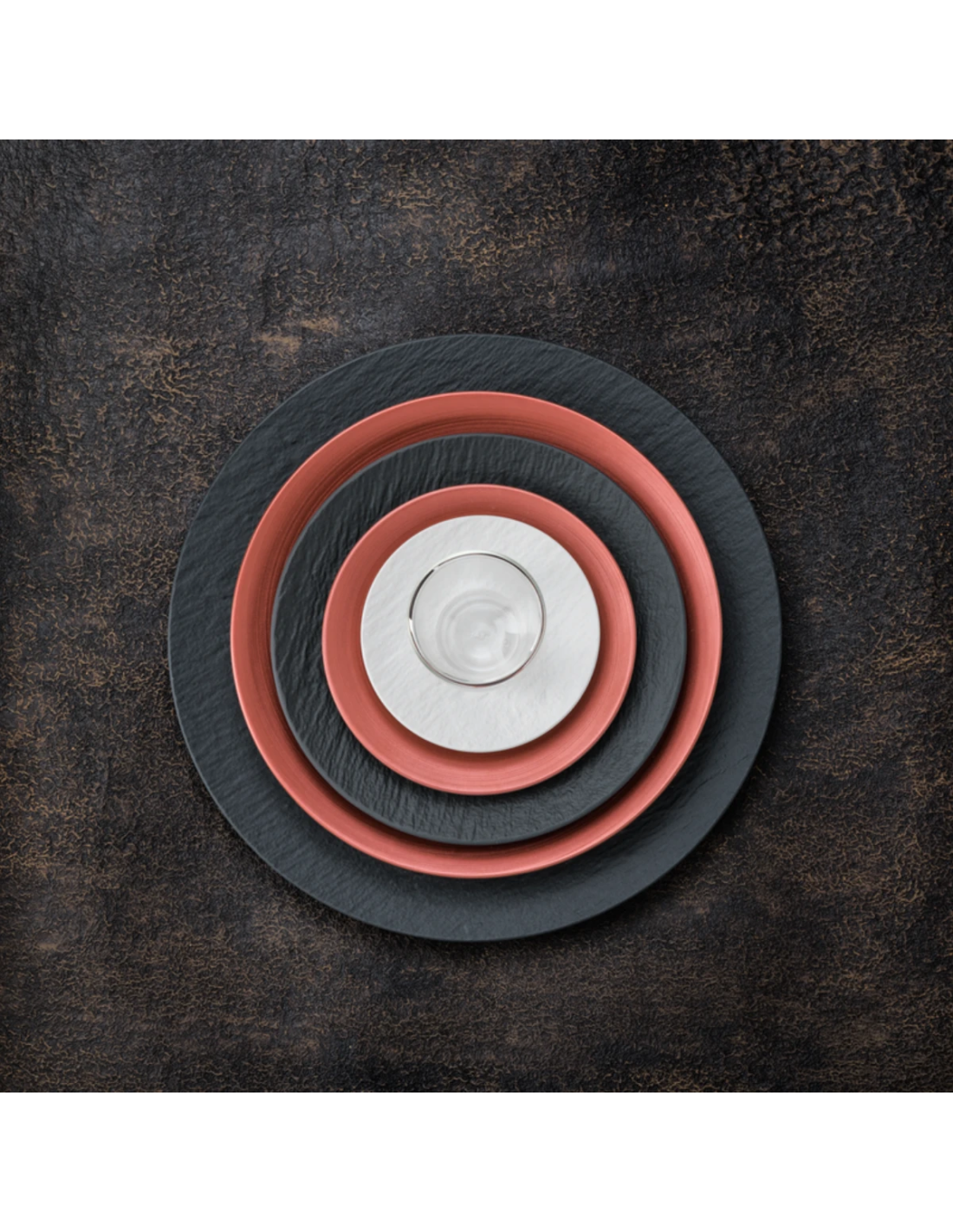 Zeker, je kunt dit koperen bord prachtig mixen met de zwarte of witte onderdelen uit de Manufacture collectie voor een modern en persoonlijk tafelconcept.