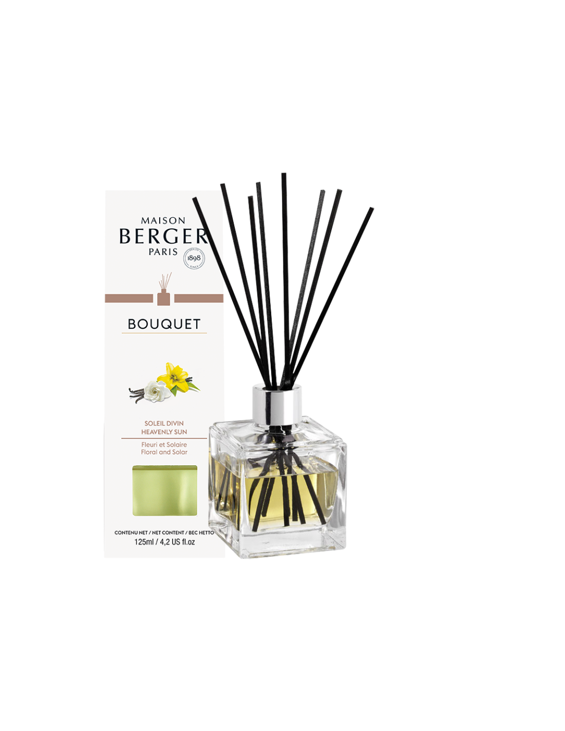 Deze stijlvolle glazen kubus met een verzilverde sierring en een boeket van zwarte sprieten die het eigentijds design onderstrepen. De stokjes die zijn vervaardigd met polymeertechniek zorgen voor een optimale diffusie van het parfum zonder dat de oplossing verkleurt. Product klaar voor gebruik, gevuld met 125ml Parfum Soleil Divin. Navulbaar met huisparfum 200ml.