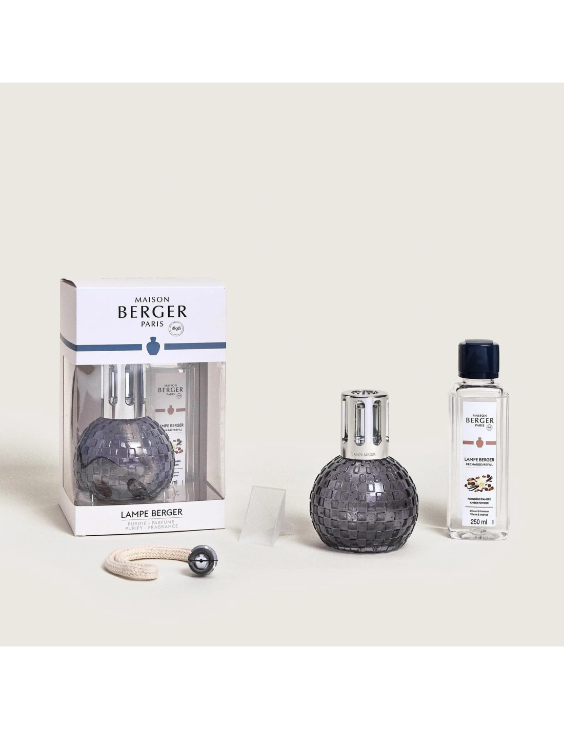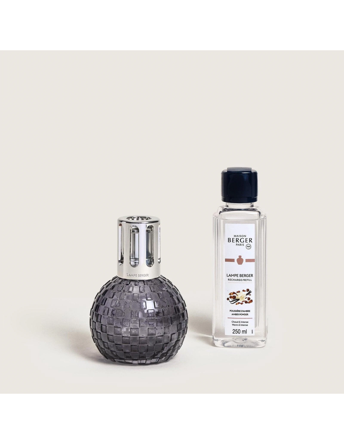 Het Lampe Berger Giftset Disco Grise onderscheidt zich door zijn ronde vorm en het dambordpatroon in glas, wat zorgt voor een moderne uitstraling. De grijze tint geeft een verfijnde toets aan uw interieur.