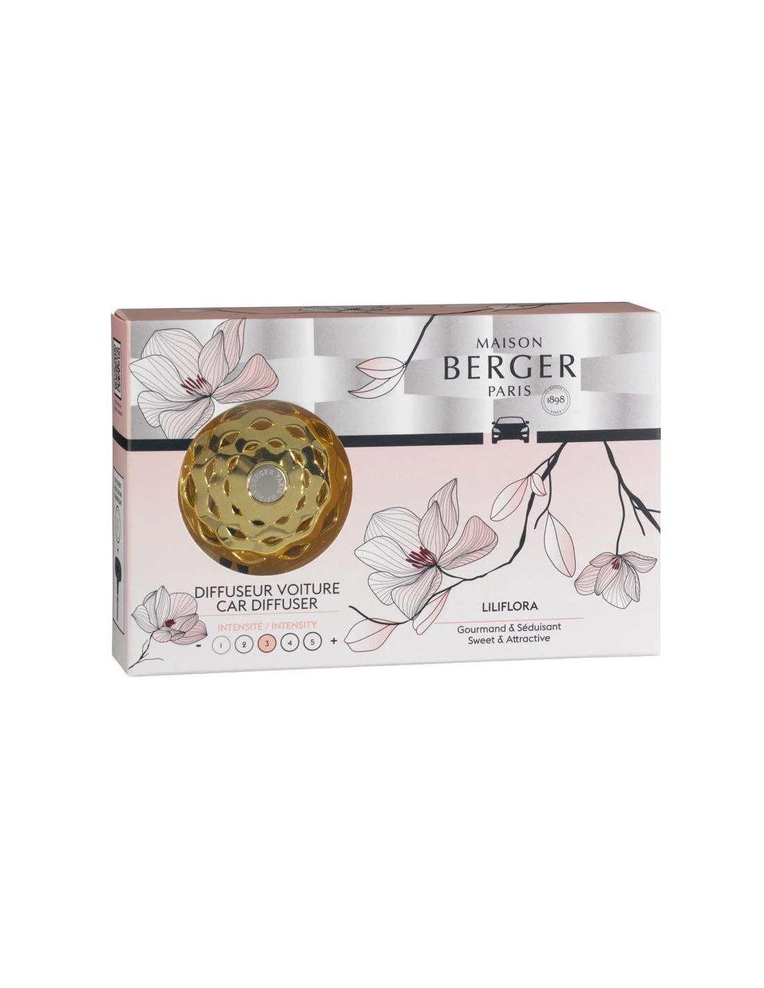 Deze diffuser is eenvoudig te bevestigen aan het luchtrooster en verspreidt Liliflora, een bloemig en modern parfum. De keramische navulling gaat ongeveer 4 weken mee en hult de auto in een waas van optimisme en vrouwelijkheid.