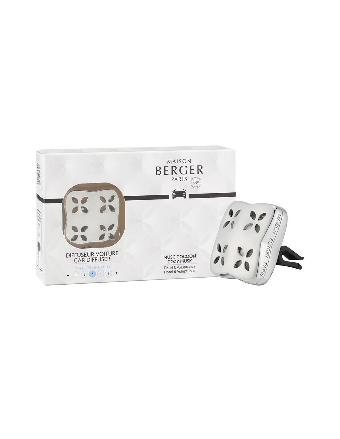 De autodiffuser Cosy Musc Cocoon nodigt u uit voor een geurige reis. Geïnspireerd door het ontwerp van de houder, voegt deze zilverkleurige verfrisser, ontworpen door DeVog, een verfijnde toets toe aan uw voertuig.