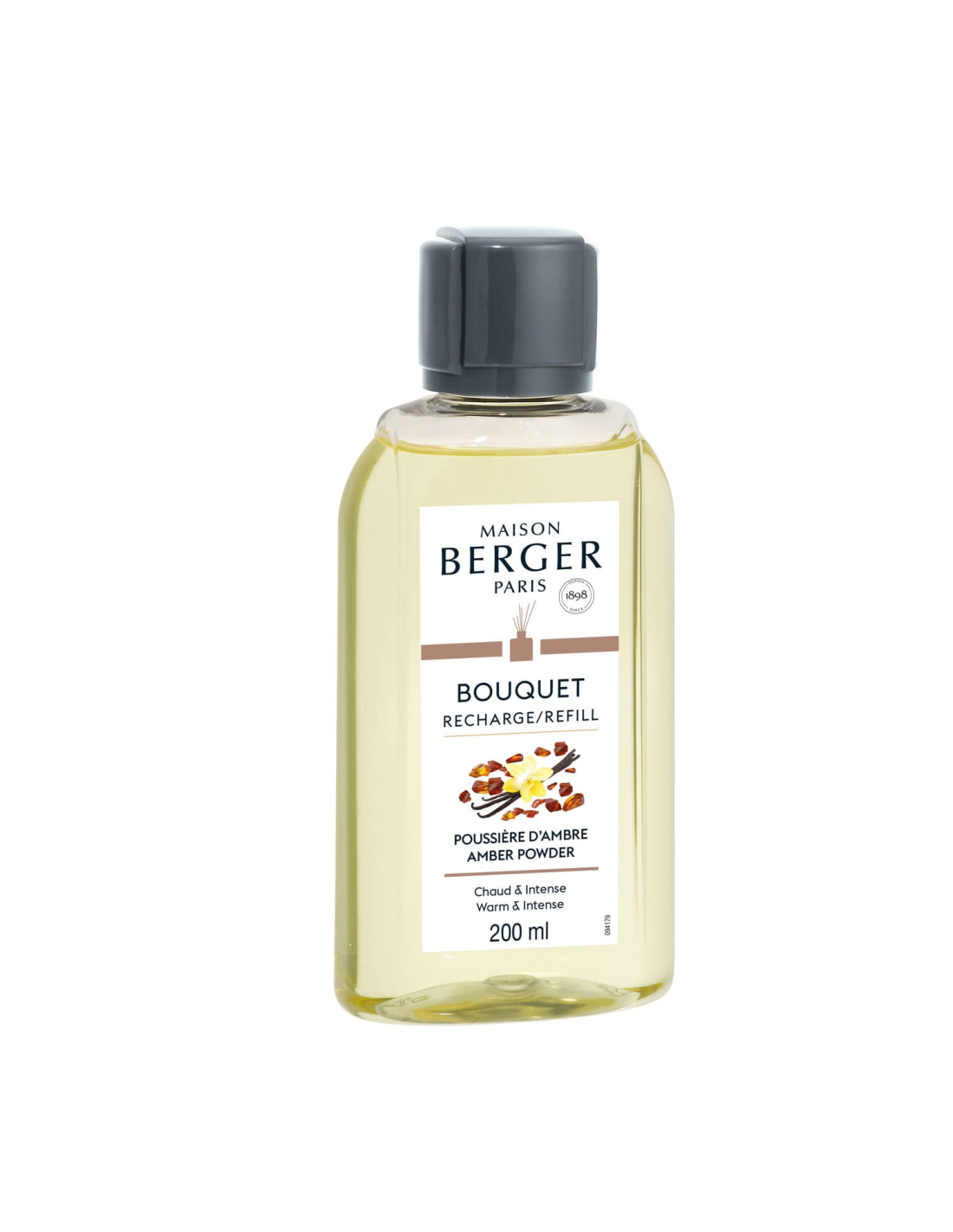 Parfum Berger Poussiere Ambre - Amber Powder is een kruidige navulling voor je stokjes en geliefde geur voor velen. Rozen, Lelietjes van Dalen en een vleugje vanille maken de Maison Berger navulling Poussiere d'Ambre een sensuele en heerlijke navulling voor je Maison Berger parfumverspreider.