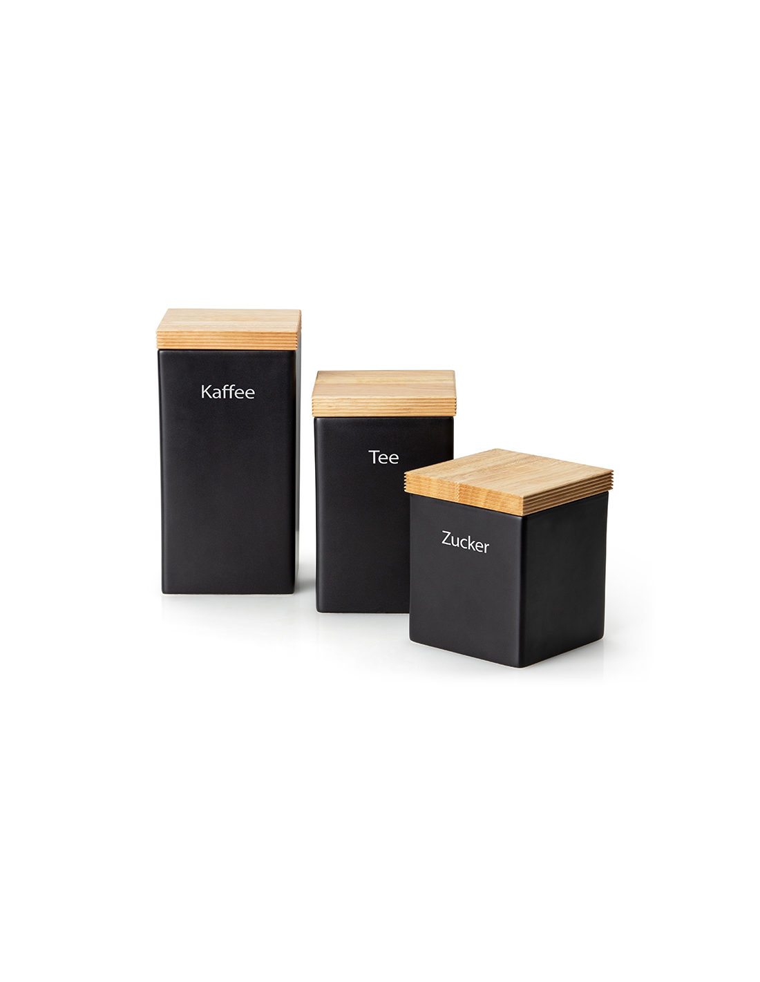 Keramische bewaardoos met een deksel van hoogwaardig hardhout. De bewaardoos is ideaal voor het bewaren van koffie, thee of suiker. Verwijderbare etiketten om te plakken zijn inbegrepen.